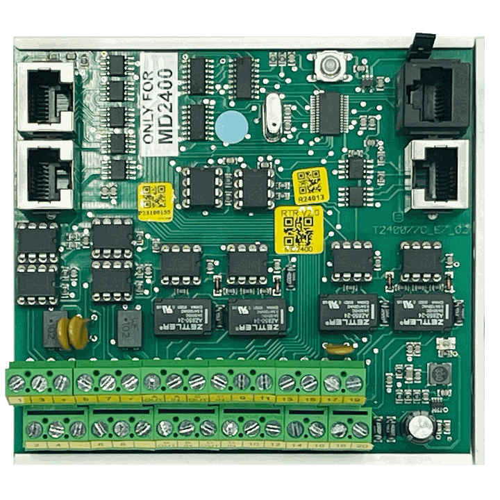 De functie van de print “MD2400 multiplex” is het splitsen van de interne enkelvoudige I/O bus in een dubbele redundante I/O bus met een hoofd- en een back-up kanaal naar de verplichte redundante bedieningsconsole aan de ingang van het gebouw die door de brandweer wordt gebruikt. Op deze wijze wordt de goede werking van het bedieningspaneel voor de brandweer gewaarborgd.